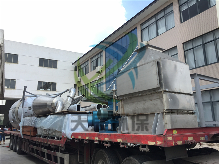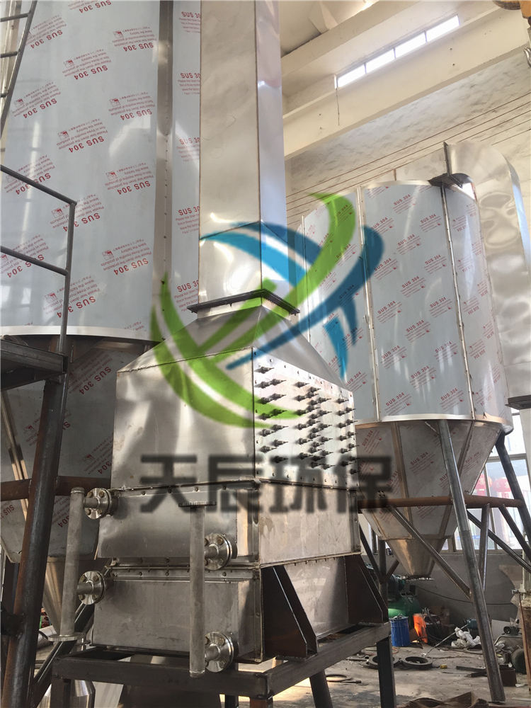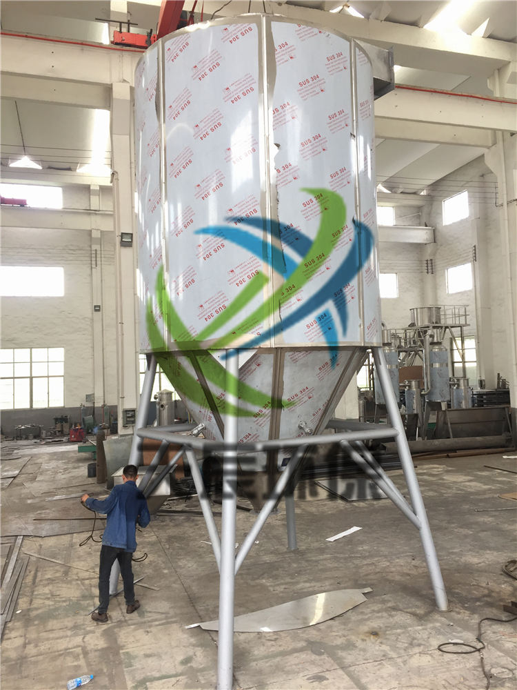 空气经过滤和加热,进入干燥器顶部空气分配器,热空气呈螺旋状均匀地进入干燥室。料液经塔体顶部的高速离心雾化器,(旋转)喷雾成极细微的雾状液珠,与热空气并流接触在极短的时间内可干燥为成品。成品连续地由干燥塔底部和旋风分离器中输出,废气由风机排空。